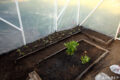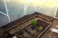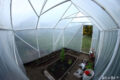 No tengo fotos de cuando colocamos el plástico porque lo hicimos de una sola vez y un día de viento donde no podíamos parar a sacar fotos. En el suelo enterré el plástico para que la misma tierra hiciera de ancla. En las esquinas puse las abrazaderas, en los laterales y el techo puse las tiras. Donde junté dos plásticos o para evitar un pliegue, hice una «costura», dos tiras con sus partes cóncavas enfrentadas que al atornillarlas sostienen firmemente el plástico. Como detalle curioso, todo el plástico que cubre el invernadero, incluyendo la puerta, es de una sola pieza.